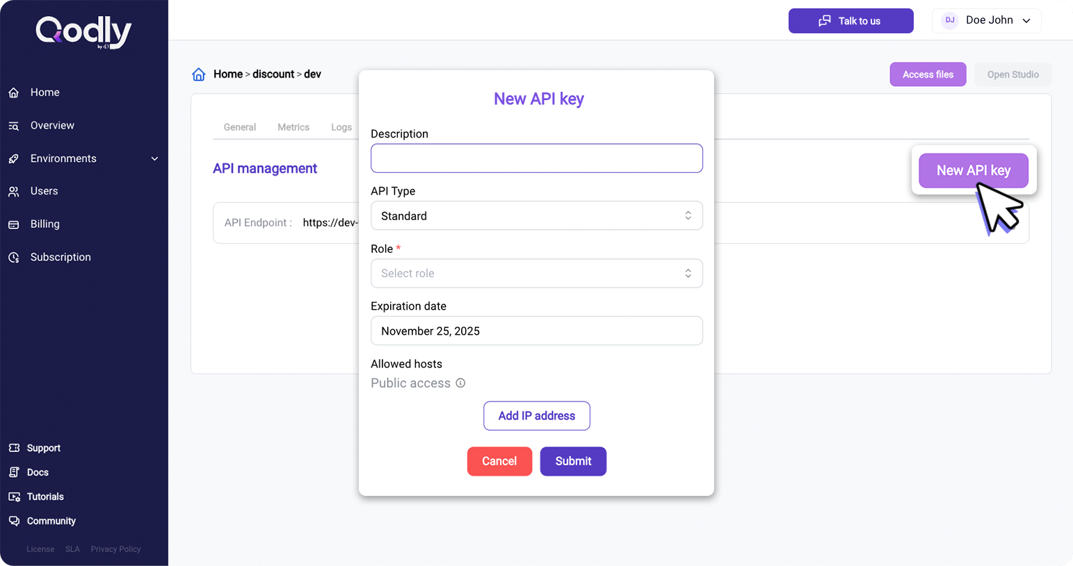 Your backend services are accessible via REST API. Qodly provides robust role and privilege features, allowing you to precisely control what you want to make available through the API. Access to your data is secured through key management in the cloud console.