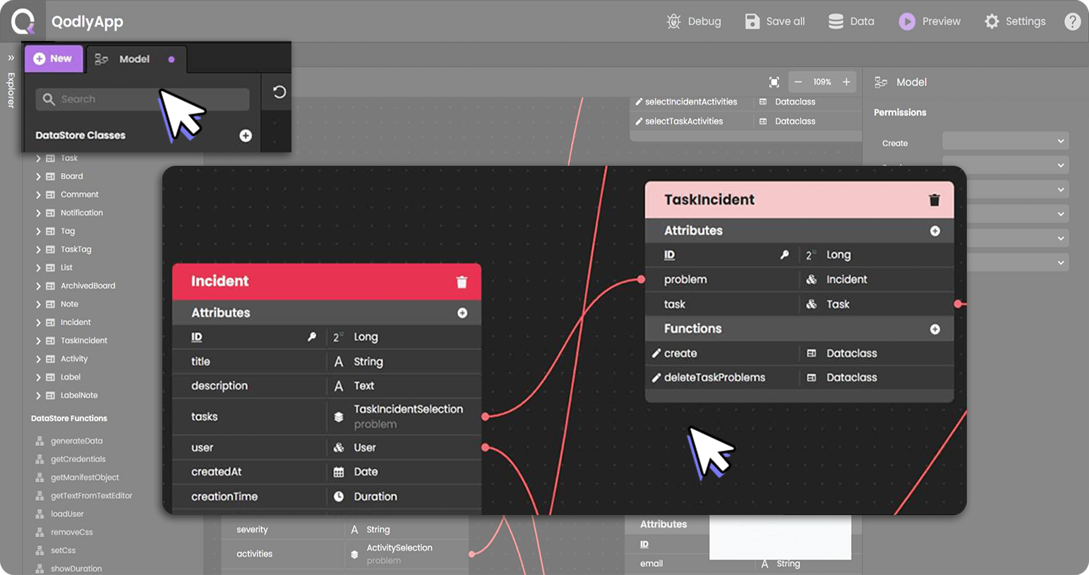Design your data models with visual editor, implement functions with code editor, establish detailed security for every tier of your data, connect your entities, and include calculated fields. Administer your data efficiently using 4D Data Explorer.