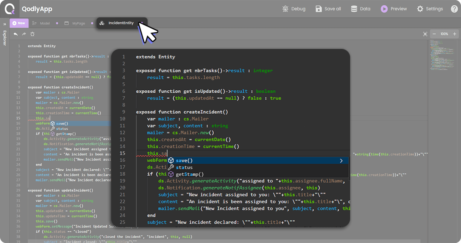 Conventional programming offers robust versatility for integrating complex business logic and workflows. Utilizing a sophisticated code editor along with an advanced debugging tool allows developers to craft unique singletons and functions that operate both at the data and server layers.