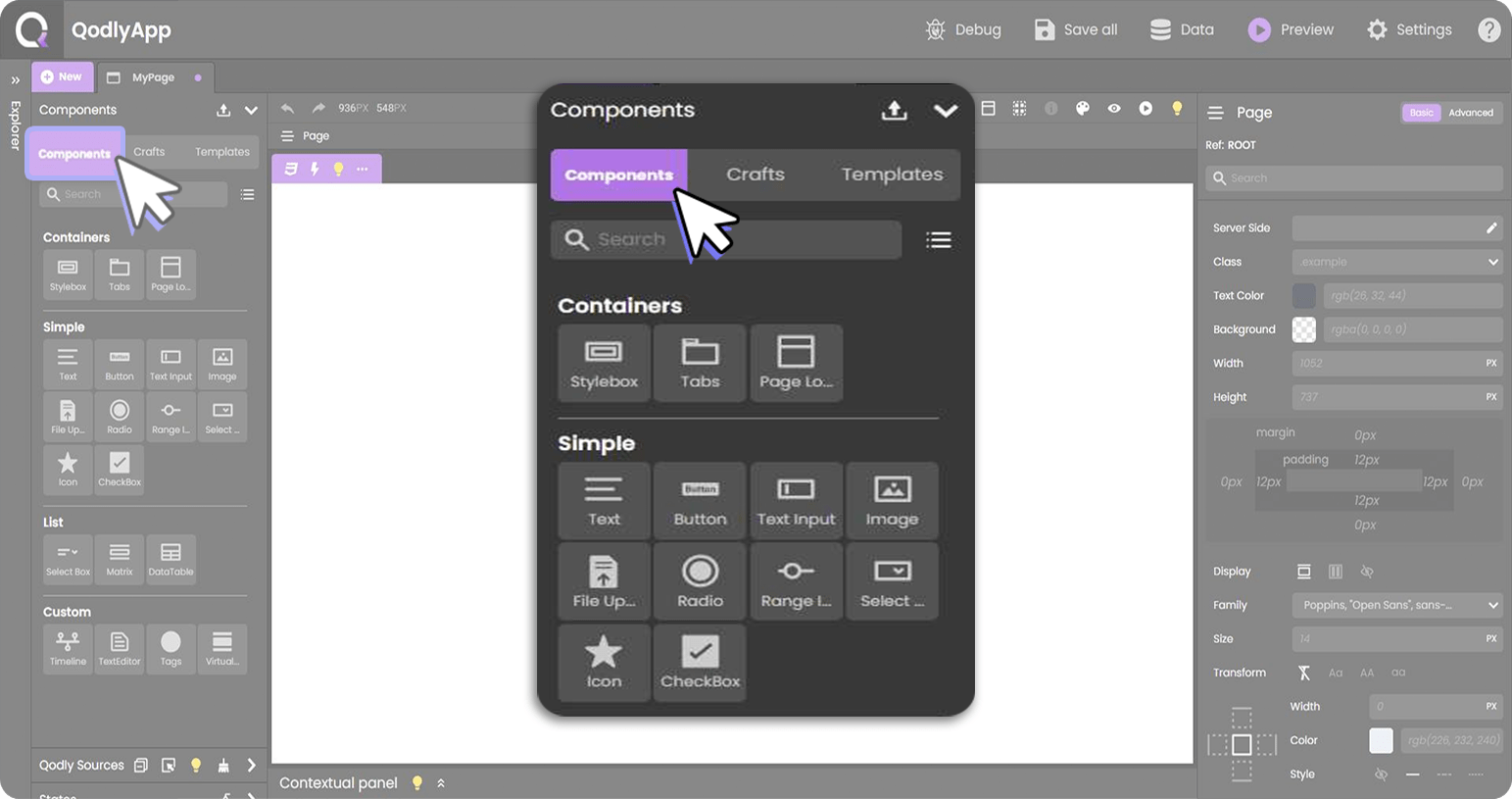 Standards and community-contributed components. Simply drag them into place and personalize as needed. Link up with the Qodly Source for your data needs. Set up all your events visually.