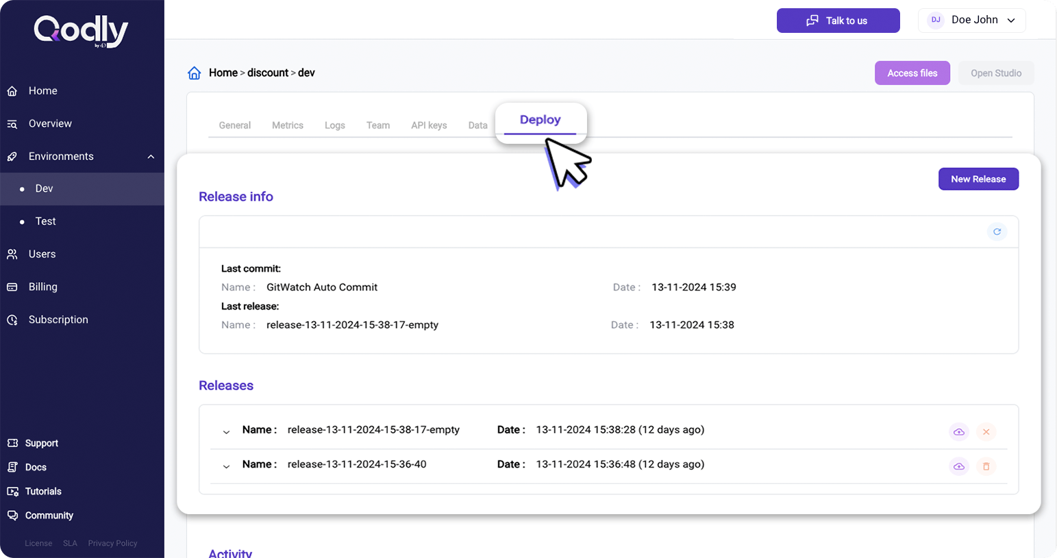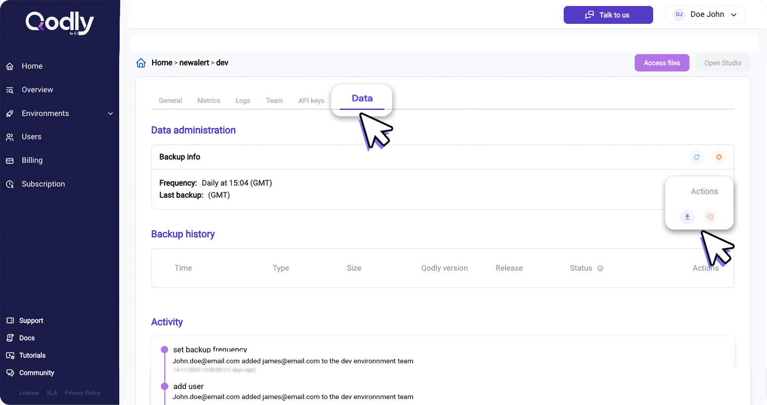 Qodly automatically backs up your data by environment. You choose the frequency, and you can restore any version at any time.