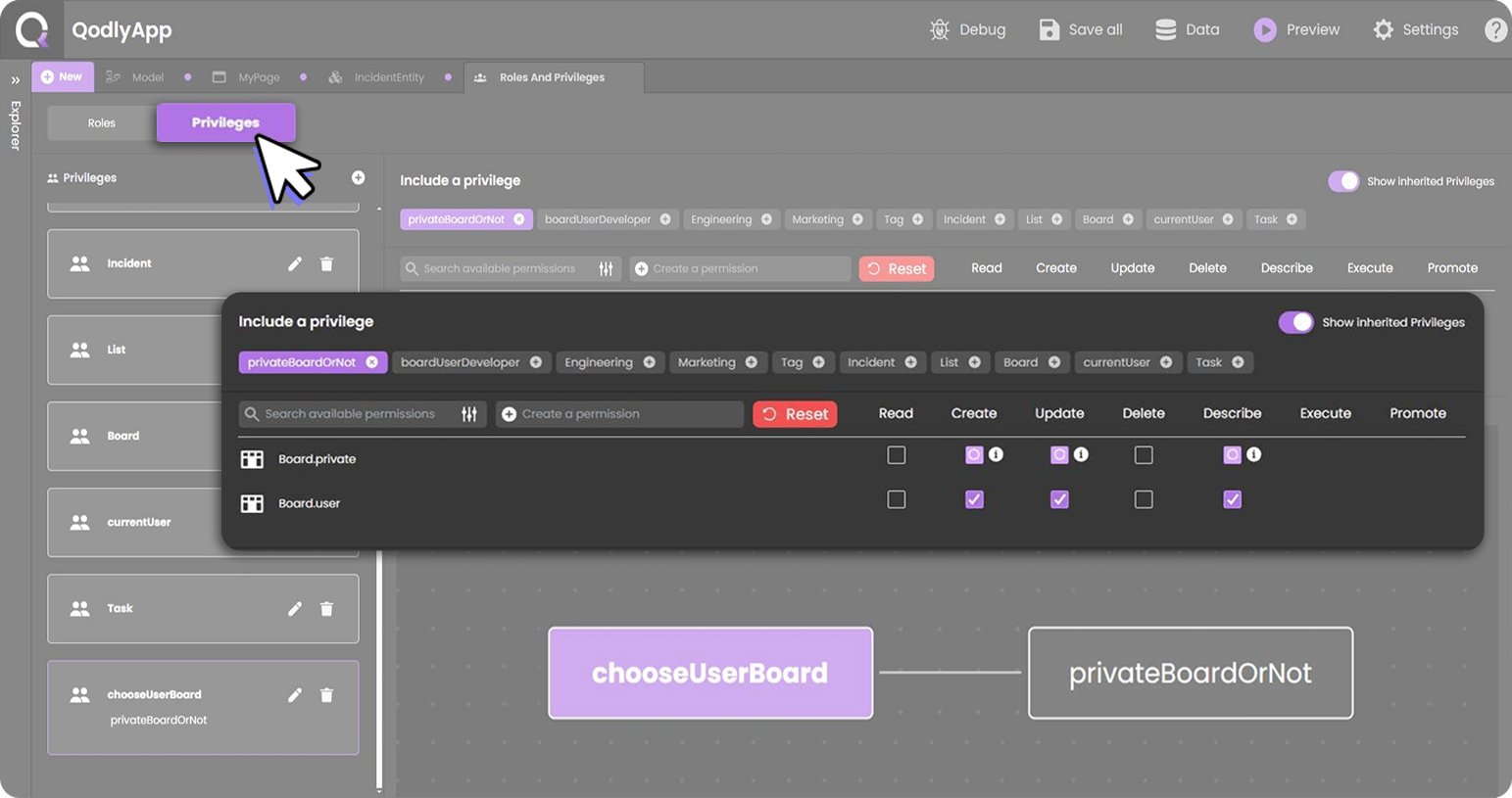 Qodly provides a roles and privileges editor where you can define access rights per role. You can set detailed access rights for each privilege by field, class, and global data model.